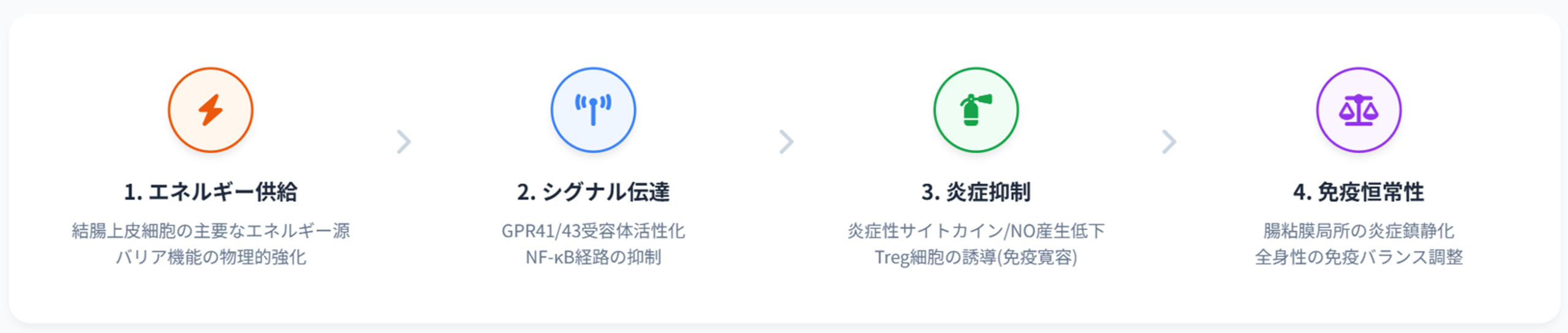 短鎖脂肪酸、とりわけ酪酸には強力な免疫調節効果と抗炎症作用が認められています。酪酸は腸管上皮細胞のエネルギー源となって上皮バリアを強化するだけでなく、免疫細胞や炎症反応にも直接作用します。