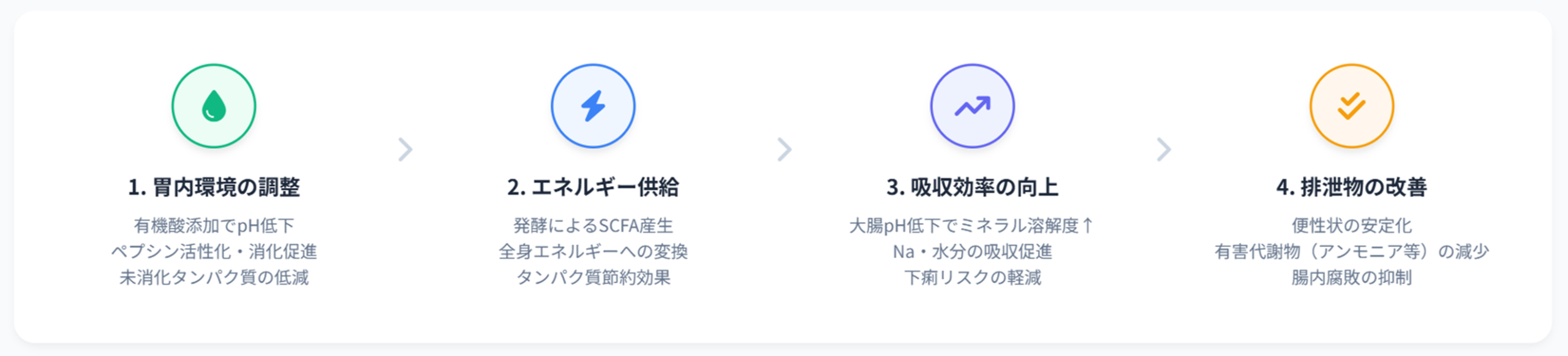 また、SCFA産生により結腸内容物のpHが下がると、カルシウムやマグネシウムといったミネラルの溶解度が上がり吸収率が向上する可能性が指摘されています。これは人を含む他種で知られる現象ですが、ペットでも発酵性繊維の添加が一部ミネラルの利用性を高める可能性があります。