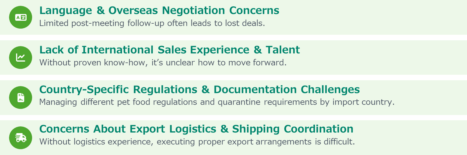 We handle everything consistently: market research in target countries, buyer sourcing, post-meeting follow-up, regulatory support, and logistics/shipping coordination—so your products can reach global markets through the shortest route.