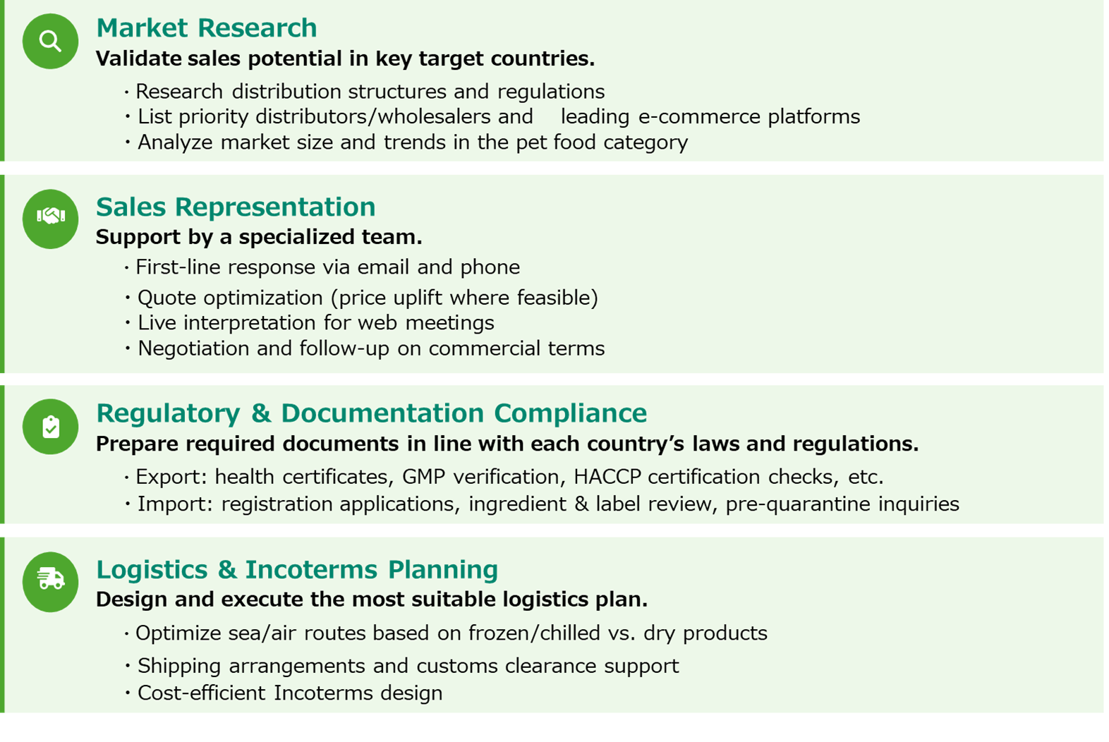 We provide hands-on overseas sales support for the contracted period (e.g., 1 month or 12 months) through a monthly retainer.