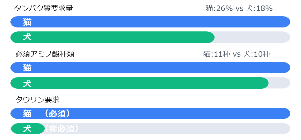 これらはアミノ酸や脂肪酸、ビタミン・ミネラル類の細かな必須量にも言及されています。特に猫はタウリンなど犬には不要な栄養素を必要とするため、動物性原料などから十分な供給が必須です。