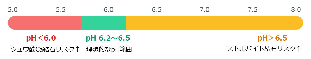 したがって尿路ヘルス設計では、ストルバイトとシュウ酸塩の双方を防げるよう尿pHを適度な範囲(おおよそ6.2-6.5)にコントロールすることが理想です。