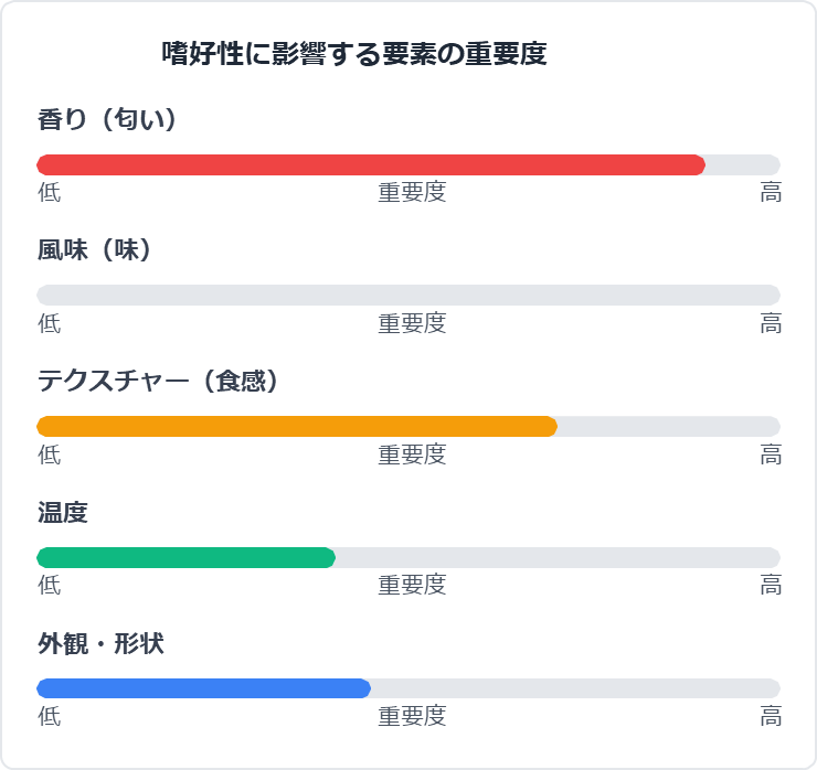 まず香り(匂い)の重要性です。猫は味蕾(味覚受容体)の数が少なく甘味を感じない代わりに、嗅覚は人間の何倍も発達しています。そのため「食欲をそそる香り」を演出することが、フードの初期摂食を促す鍵となります。