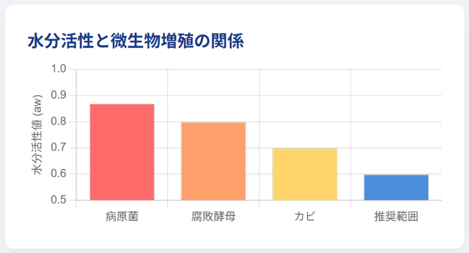 一般的に病原菌はaw0.87未満、腐敗酵母はaw0.80未満、カビはaw0.70未満で増殖が停止すると言われており、安全域を見込んでaw0.60程度以下に管理するのが理想です。