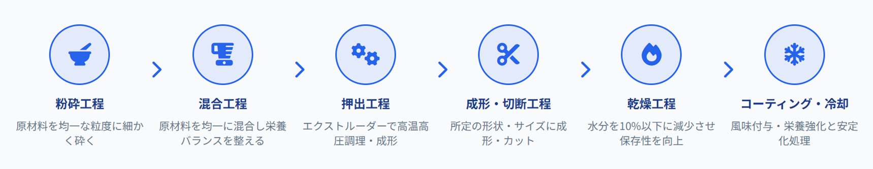 これらの工程では、ドッグフードの形状やサイズを決定づける作業が行われます。見た目だけでなく、犬の嗜好性や食べやすさ、消化性にも大きく関わるため、非常に重要な役割を果たしています。