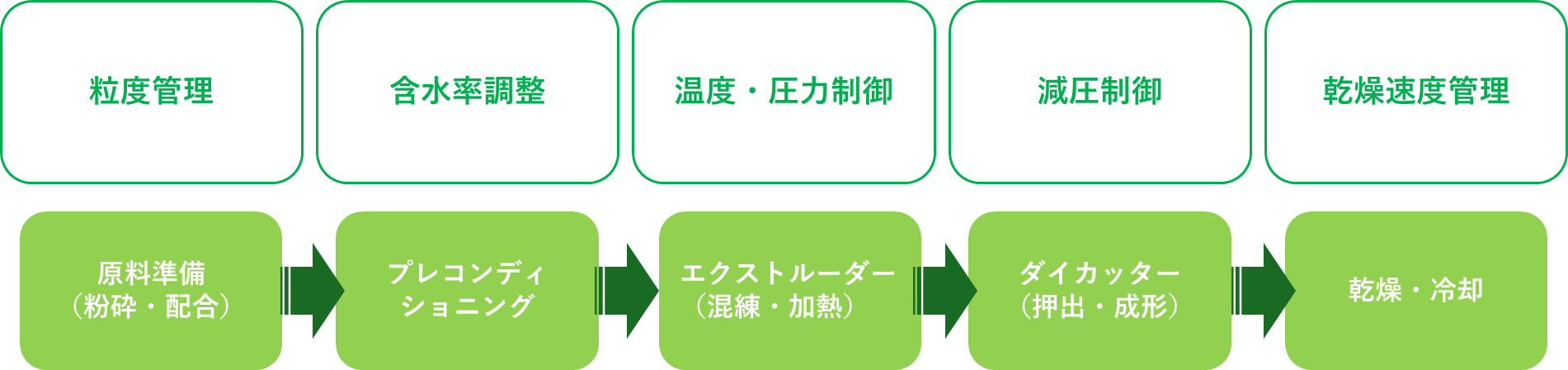 また、エクストルーダーは短時間で100-150℃以上の高温を達成するため、デンプンの糊化と同時にタンパク質の変性や殺菌も行われ、安全で安定した製品に仕上げることができます。