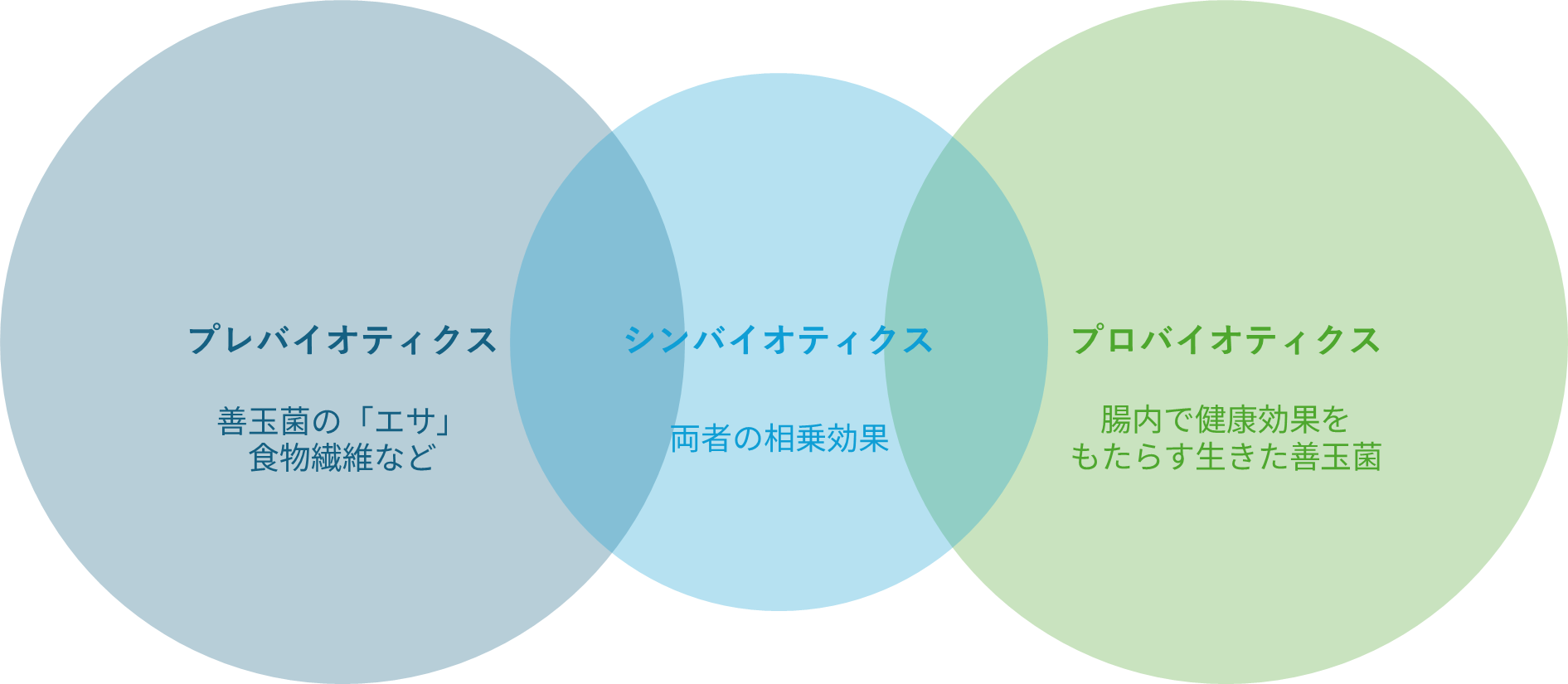 シンバイオティクスとは、プロバイオティクス(腸内で健康に良い働きをする生きた善玉菌)とプレバイオティクス(善玉菌のエサとなる難消化性の食物繊維など)を組み合わせたものです。