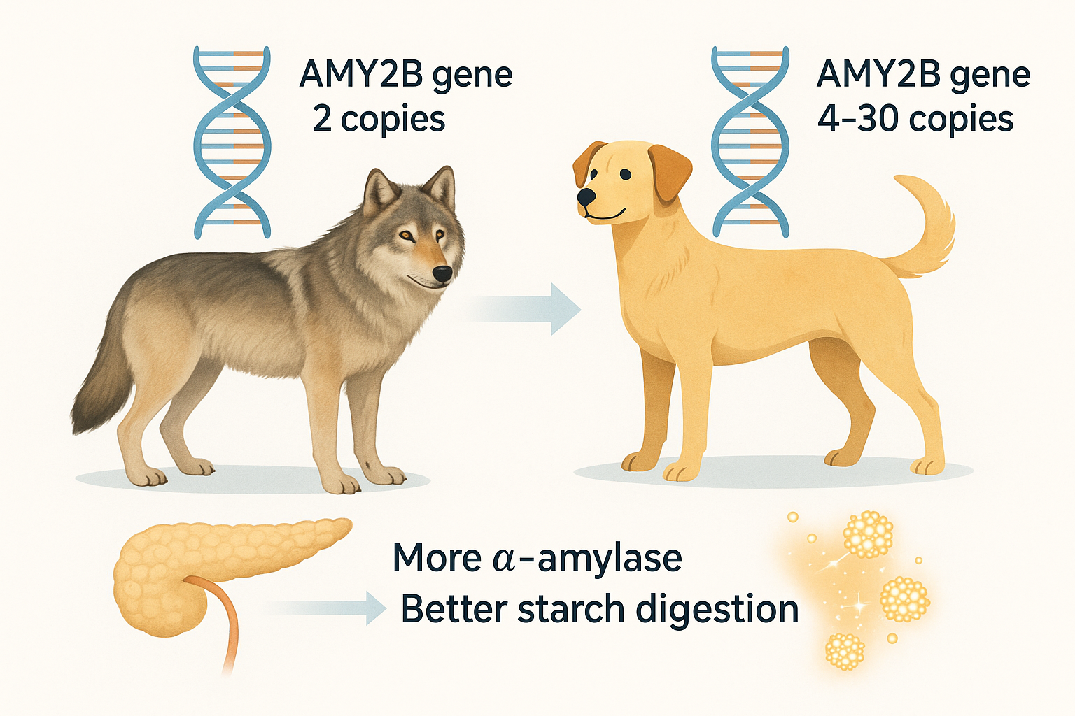 犬では、膵臓アミラーゼの遺伝子にあたるAMY2Bが増えているのが大きな特徴です。オオカミはふつう2コピーしか持ちませんが、犬は集団や品種によって4-30コピーにまで増えていることがあります。平均すると犬はオオカミの約7倍多く、この遺伝子の増え方(重複)によって膵臓から出るα-アミラーゼという消化酵素がたくさん作られ、デンプンをブドウ糖に分解する力が高まったと考えられています。
