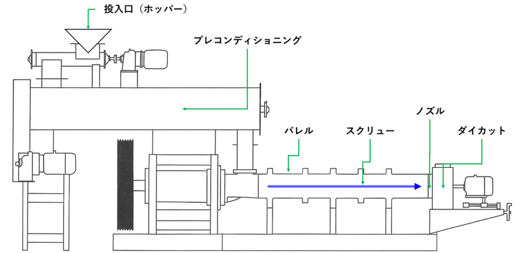 そのため、プレコンディショナーと呼ばれる装置で原料に蒸気と水分をあらかじめ加え、適切な含水率と温度(70-120℃程度)まで予熱してから押出し機に投入するのが一般的です。プレコンディショナーでの予備糊化によって押出し機バレル内での糊化効率が高まり、均一な製品品質を得やすくなります。